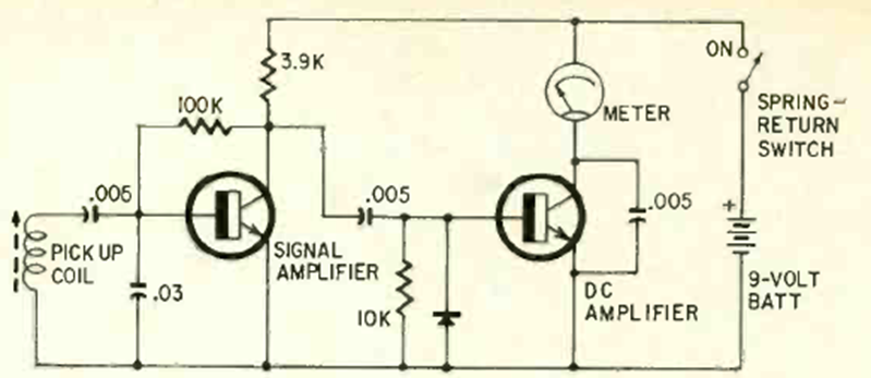 We found this circuit in a Radio Electronics from October 1965. The pickup coil can be of the telephone type and the instrument is a micro or milliammeter that should preferably have a current limiting resistor in series.