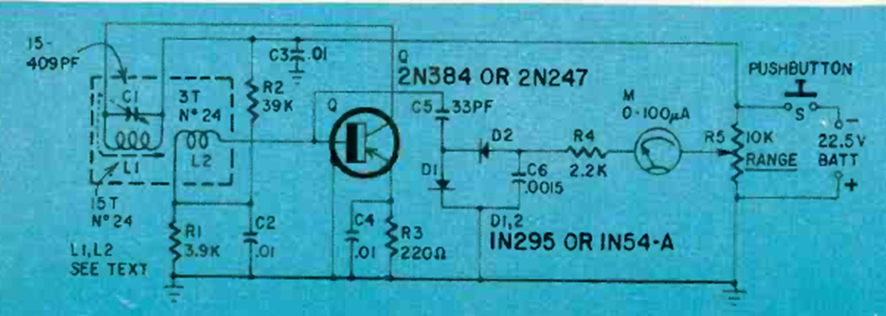 This oscillator with base current drop can be used like the well-known grid-dip meters, but which are based on valves. The circuit is from a Radio Electronics from June 1963. The transistor is a type of germanium from that time. The coils depend on the desired operating frequency.