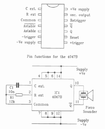 This circuit was found in old documentation. The frequency depends on R1 and C1. For the components used, the frequency is in the range of a few hundred kilohertz.