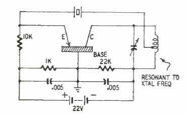 This crystal-controlled circuit with 60 mW output power is in the Radio Electronics magazine of 1950. The frequency is at most about 100 kHz.