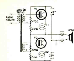 This power stage with transistors is stabilized by two lamps. The circuit was published in Radio Electronics magazine in April 1962. The transistors and power were not indicated.