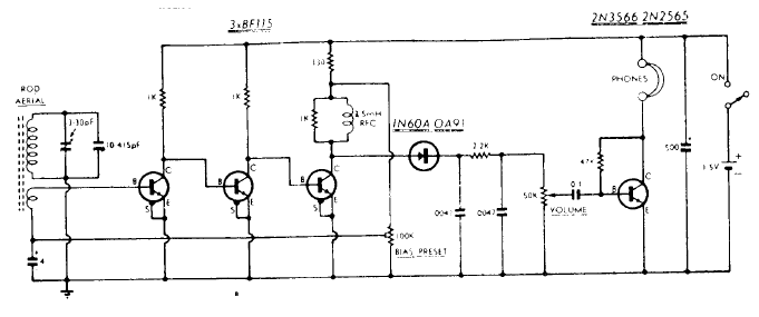 We found this circuit in an English publication from the 60's. The transistors are of germanium of the time and the headphones must be high impedance magnetic.