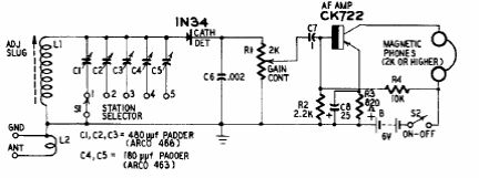On this 1960s circuit, stations are pre-tuned in trimmers and then selected by a switch. The transistor is made of germanium and the listening is in high impedance headphones.