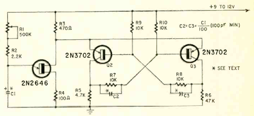 The difference between this circuit and the previous one is that it uses PNP transistors. The circuit is from Radio Electronics magazine from July 1968. The frequency depends on R1 and C1.
