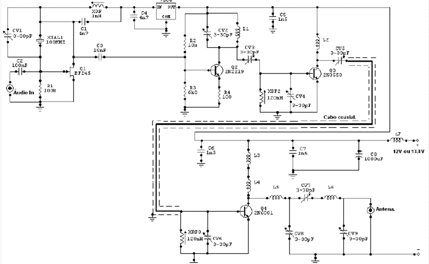 The transmitter frequency is adjusted by choosing crystal oscillator1 and setting CV1. Coils L5, L6 and trimmers CV8 and CV9 form an output filter to minimize possible interference. The coaxial cable that carries the signal from the exciting stage to the final stage must be a maximum of 25 cm and the mesh can be grounded at any negative point in the circuit. The capacitors are ceramic except for the adjustable capacitors, which must be plastic or porcelain. The plate used for assembly must be made of good quality fiberglass. To adjust the transmitter, a frequency meter and a phantom load must be used and for use with a coupled antenna, an R.O.E. meter must be used.