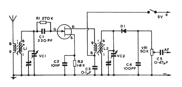 This tuner circuit was found in an old English documentation. The JFET can be any general purpose one. Coil data not provided.