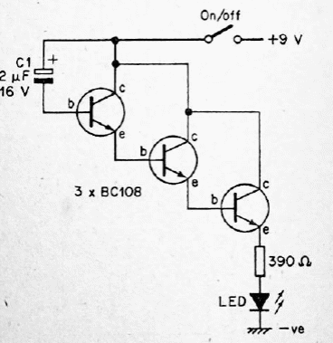 Once turned on, this circuit causes an LED to remain lit for approximately 30 minutes. Larger capacitors can be used for longer. The transistors can be the BC548.
