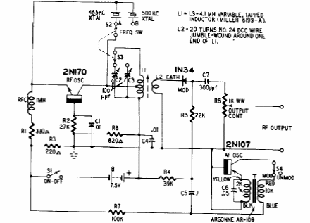 This circuit was found in an American documentation from the 60's. The circuit generates two frequencies for calibration and is modulated with an audio signal. Transistors are from the time.