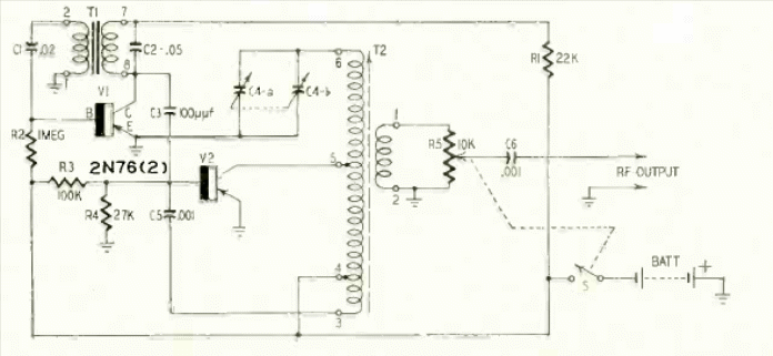 This simple signal generator with transistors was published in Radio Electronics magazine in November 1957. The circuit generates signals determined by the coil and modulation by the transformer.