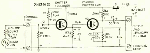 This circuit is from a Radio Electronics from August 1952. Types of the time are used, the first ones available on the market. The circuit is battery powered and has a high impedance output.