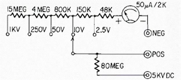 In the figure we have the circuit of a simple voltmeter with a 50 uA instrument and a 2k coil. The circuit includes a high voltage scale. Track selection is done by key.