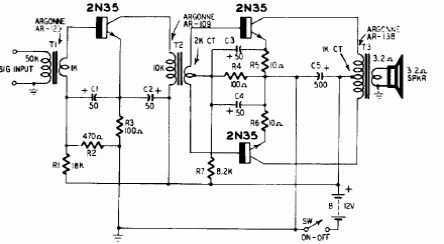 This class B push-pull amplifier circuit with a few hundred milliwatts of power was found in an American publication from the 50's. The couplings are made by transformer.