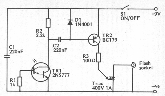 This circuit, for older machines, fires a second flash with the light received with the first, thus providing two simultaneous light sources. The components admit equivalents.