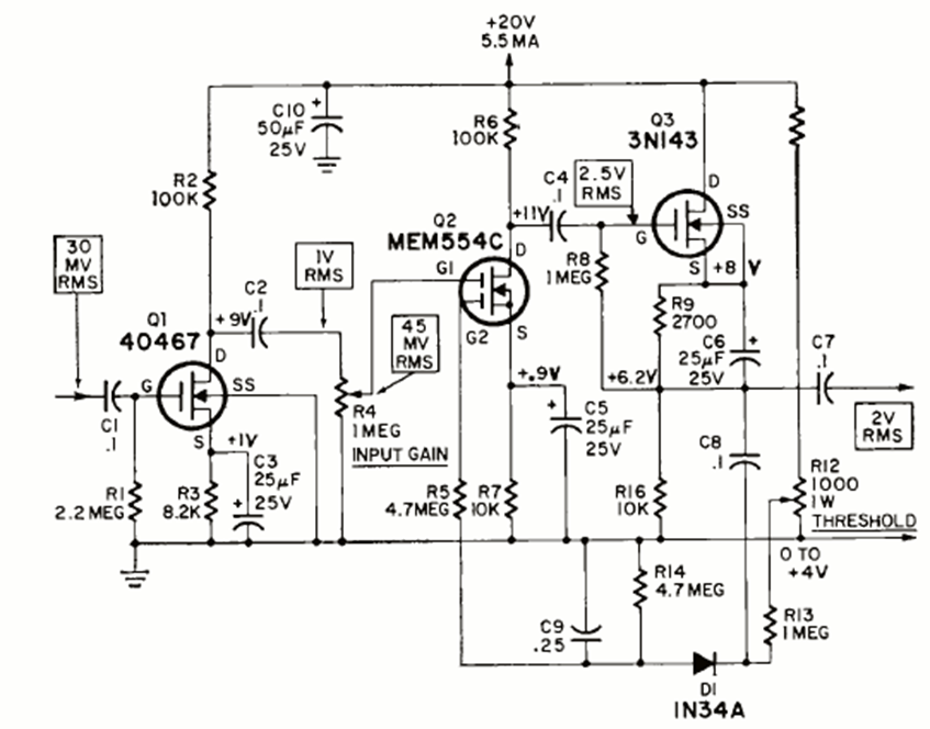 This MOSFET circuit for microphone applications was found in the December 1969 issue of Radio Electronics magazine. The transistors are uncommon today.