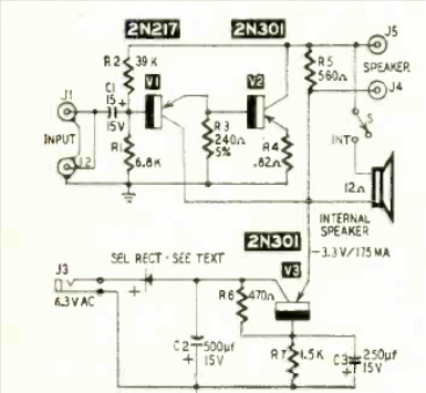 This small auxiliary amplifier was found in a Radio Electronics from May 1958. Power is supplied with 6.3 V from a small transformer. Transistors are types of the time.