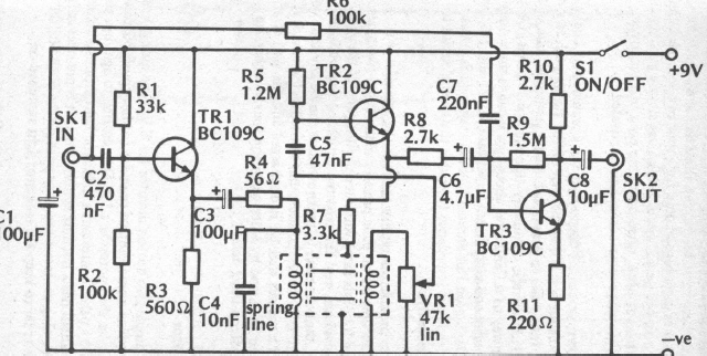 We found this circuit in an English documentation from the 80's. Transistors can be modern equivalents like the BC549. The reverb unit can be ready-made, currently difficult to obtain, or built with springs.