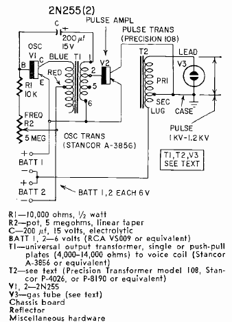 Found in a Radio Electronics magazine from March 1950, this circuit uses a high-power neon lamp common at the time. Power is supplied with batteries.