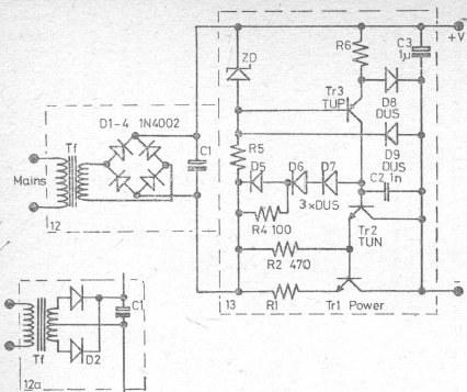 The output current of this power supply depends on the power transistor and the transformer and can reach 3 A. The circuit is from an English publication from the 80's. The power transistor can be the 2N3055.