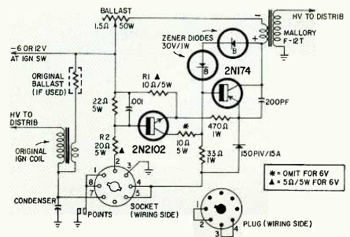Another electronic ignition circuit for cars with positive ground. This circuit is from a Radio Electronics from December 1964. The circuit uses two transistors, with the power transistor having a heat radiator.