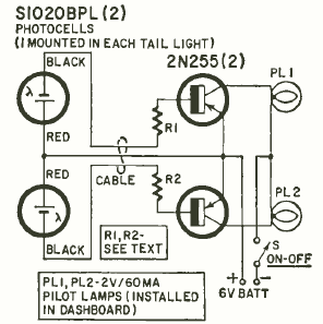 This circuit for the car uses LDRs as sensors and does not need to be connected to the lamp. The circuit is from an April 1961 Radio Electronics magazine.