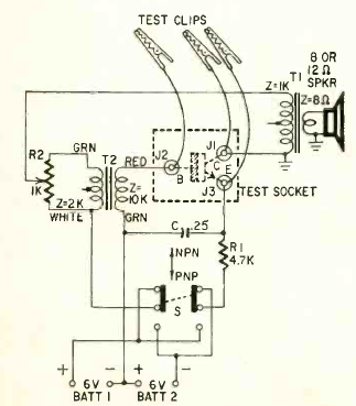 If the circuit oscillates, emitting sound, it is because the transistor is good. This simple transistor tester was found in the June 1961 Radio Electronics magazine.