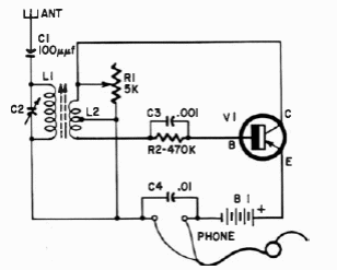 This simple high-impedance regenerative headphone receiver uses a 2N107 germanium transistor. The circuit is from a 1966 documentation.