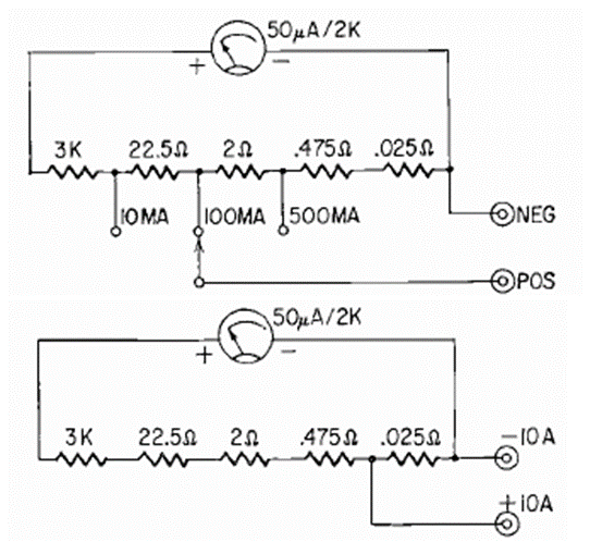 This is the basic circuit of a milliammeter with a 50 uA instrument and 2k coil resistance. Calculations can be made for instruments with other characteristics. The second circuit includes 10th contact without passing through the switch, for greater safety.