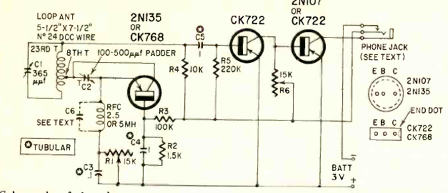 This sensitive receiver for the medium wave range was found in Radio Electronics magazine from December 1960. The circuit has a headphone output and is powered by just 3 V.