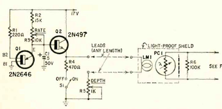 This optically coupled circuit was found in the February 1968 Radio Electronics magazine. The circuit uses an LDR in modulation. Transistors are types of the time.