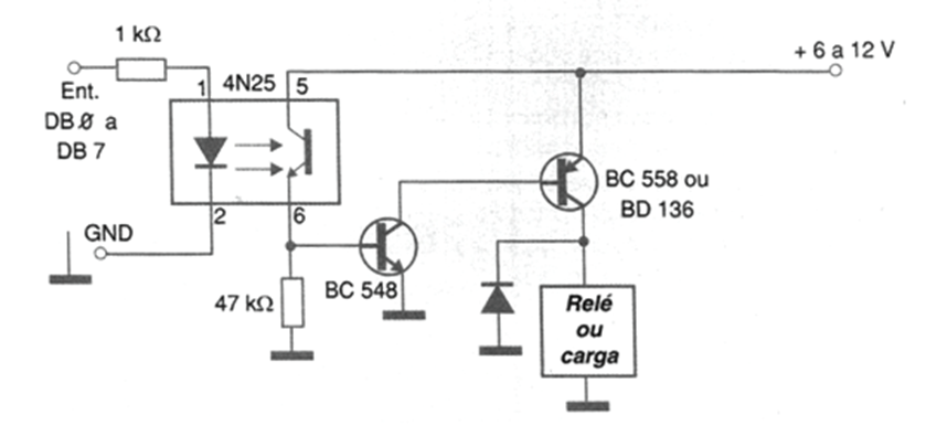 To control relays or DC motors safely with double isolation via the parallel port, we suggest the circuit in the figure. The optical isolator isolates the microprocessor or PC circuit from the relay drive circuit, which can operate with a voltage other than 5 V. In fact, using 12 V relays can achieve better performance. 12 V relays are easier to obtain, more sensitive and can therefore facilitate the assembly of the interface. The value of resistor R1 must be chosen according to the type of optical coupler used in order to obtain the ideal trigger point. with the door signal at high level. One possibility to find the best value is to use a trimpot in the project development and then replace it with a fixed resistor. Considering that common 12 V relays are specified for a current of 50 mA, the source must be sized considering the times when all of them are activated. Thus, for an interface in which the 8 parallel port outputs are used, the source must be capable of supplying the required 400 mA.