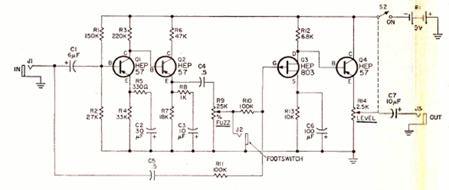 This sound effect circuit is from a Radio Electronics magazine from December 1969. The transistors support equivalents and the power is provided by a battery to reduce the possibility of noise.