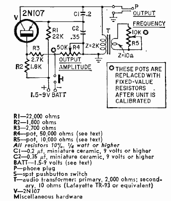 This single-transistor oscillator was found in Radio Electronics magazine from February 1962. The circuit uses a miniature transformer of the time and power comes from batteries.