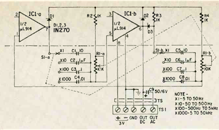 Integrated signal generator appeared in Radio Electronics magazine in January 1968. The integrated circuits are from the time and the generator produces signals from 5 Hz to 50 kHz.