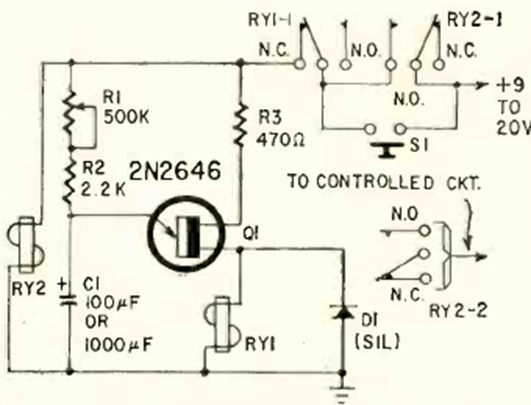This other circuit from the June 1968 Radio Electronics magazine has a driver transistor and a latch system. The circuit provides delays of up to 8 minutes depending on the value of C1.