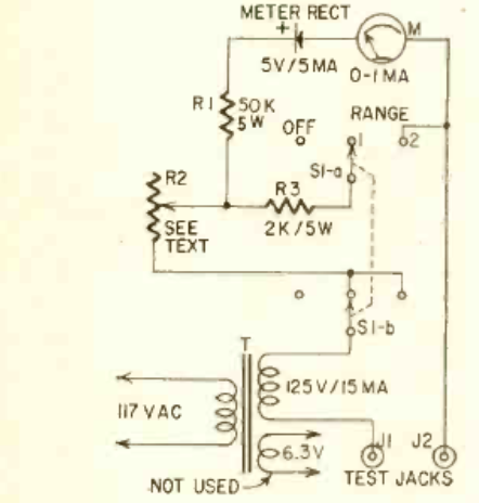 Measuring capacitances and resistance this simple instrument was found in Radio Electronics magazine from September 1958. It uses a 1 mA full scale analog instrument.