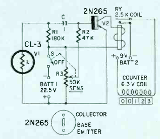 This circuit that drives an electromechanical counter of the time was found in Radio Electronics magazine from September 1959. The sensor is an LDR of the time.