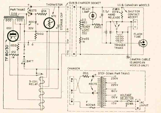 This 60’s commercial flash was found in the march 1961 Radio Electronics Magazine. The circuit uses only one transistor and a high voltage transformer. A power supply input is provided to power it from the power grid.