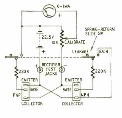 This circuit for testing commercial NPN and PNP transistors was found in Radio Electronics magazine from March 1958. The indicator is analog 1 mA.