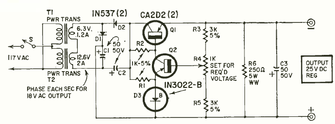 This is the power supply circuit for the amplifier in the previous circuit. The source is adjustable and uses power transistors of the time. The AC transistor must be mounted on a heat sink.