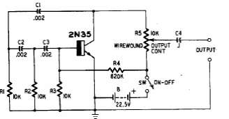 This sinusoidal oscillator with a transistor was found in a publication from the 60's. The transistor is of the time and the frequency determined by the capacitors of the phase shift network.