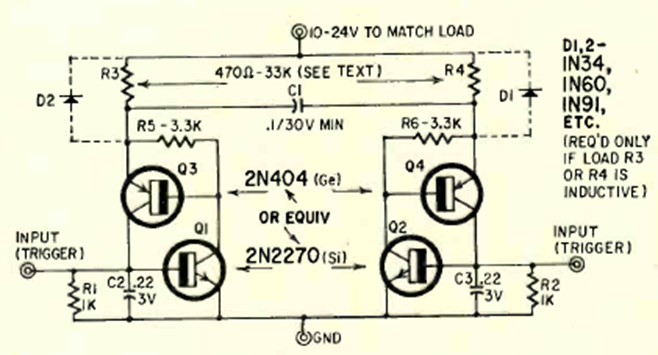 This interesting circuit from Radio Elecronics from October 1965 shows a flip-flop or bistable with SCRs simulated by bipolar transistors.