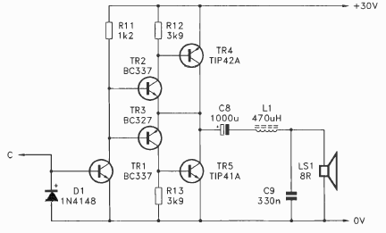 This amplifier of a few watts of power was found in English documentation from 1995. Power transistors must be equipped with heat sinks.
