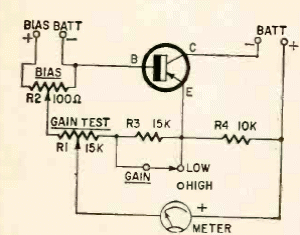 This bridge-biased transistor test circuit measures gain in the range 0 to 300. Circuit is from Radio Electronics June 1952.