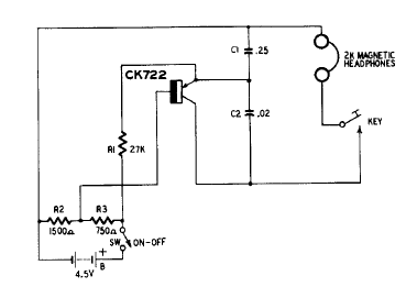 We found this circuit in an American documentation from the 50's. The transistor is made of germanium and the headphones must be high impedance magnetic. Frequency is given by the capacitors.