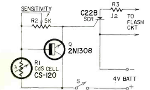 This circuit was found in Radio Electronics magazine from June 1964. The components are from the time, but they admit equivalents such as the transistor which could be the BC548 and the SCR which could be the TIC106. It is intended for firing a camera flash.