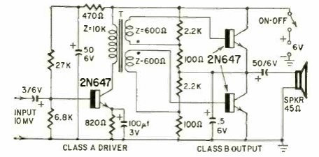 One of the first transistor amplifiers with transformerless output but using a 45-ohm speaker. This class B circuit came out in a September 1950 Radio Electronics.