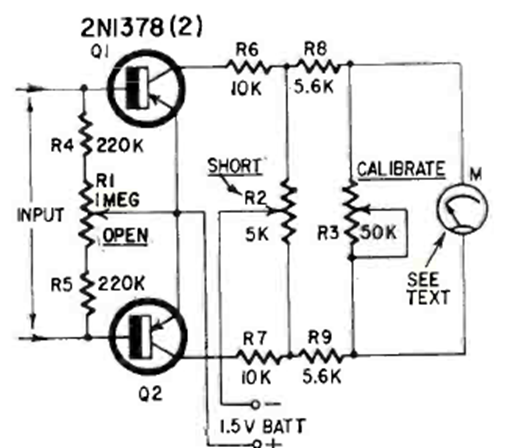 This sensitive two-transistor current meter was found in the June 1964 Radio Electronics magazine. Modern general-purpose transistors can be used. The circuit measures currents below 150 uA. The instrument is 15 uA.