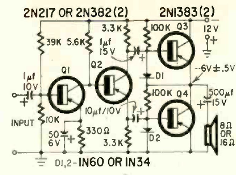 This audio circuit was published in a Rado Electronics issue from October 1963. The transistors are from the time and the output is low impedance. Power is supplied with a voltage of 12 V.