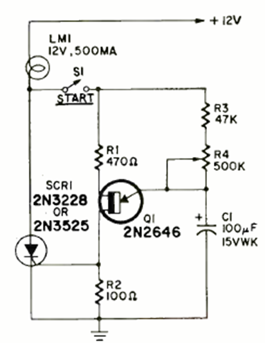 This circuit was found in the July 1969 issue of Radio Electronics magazine. It also appeared in an English publication by R. Marston. The circuit is applicable to virtually any sensitive SCR.