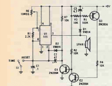 We found this circuit in Popular Electronics from 1992. Time is given by C1. The circuit provides an output beep. Transistors support equivalents.